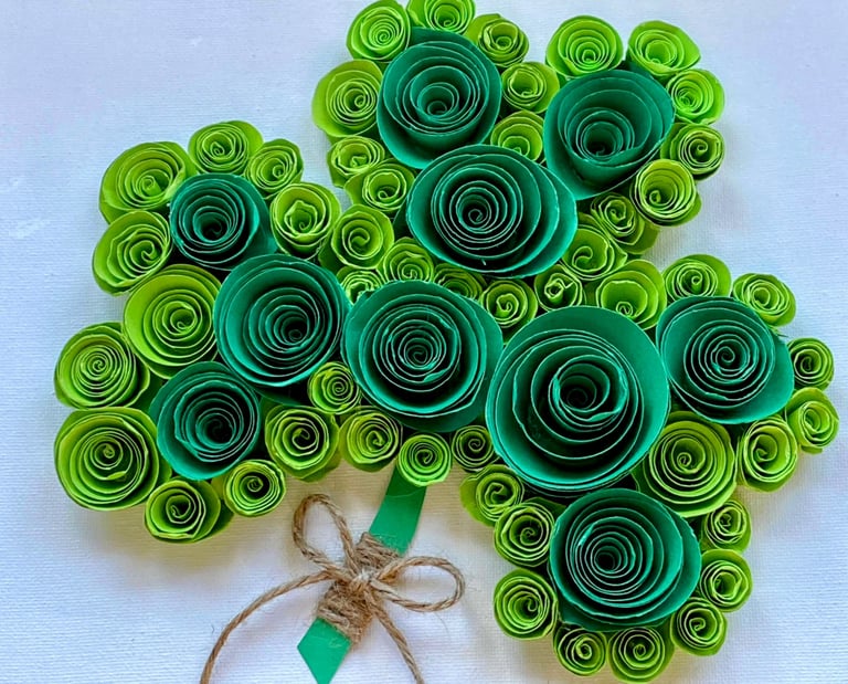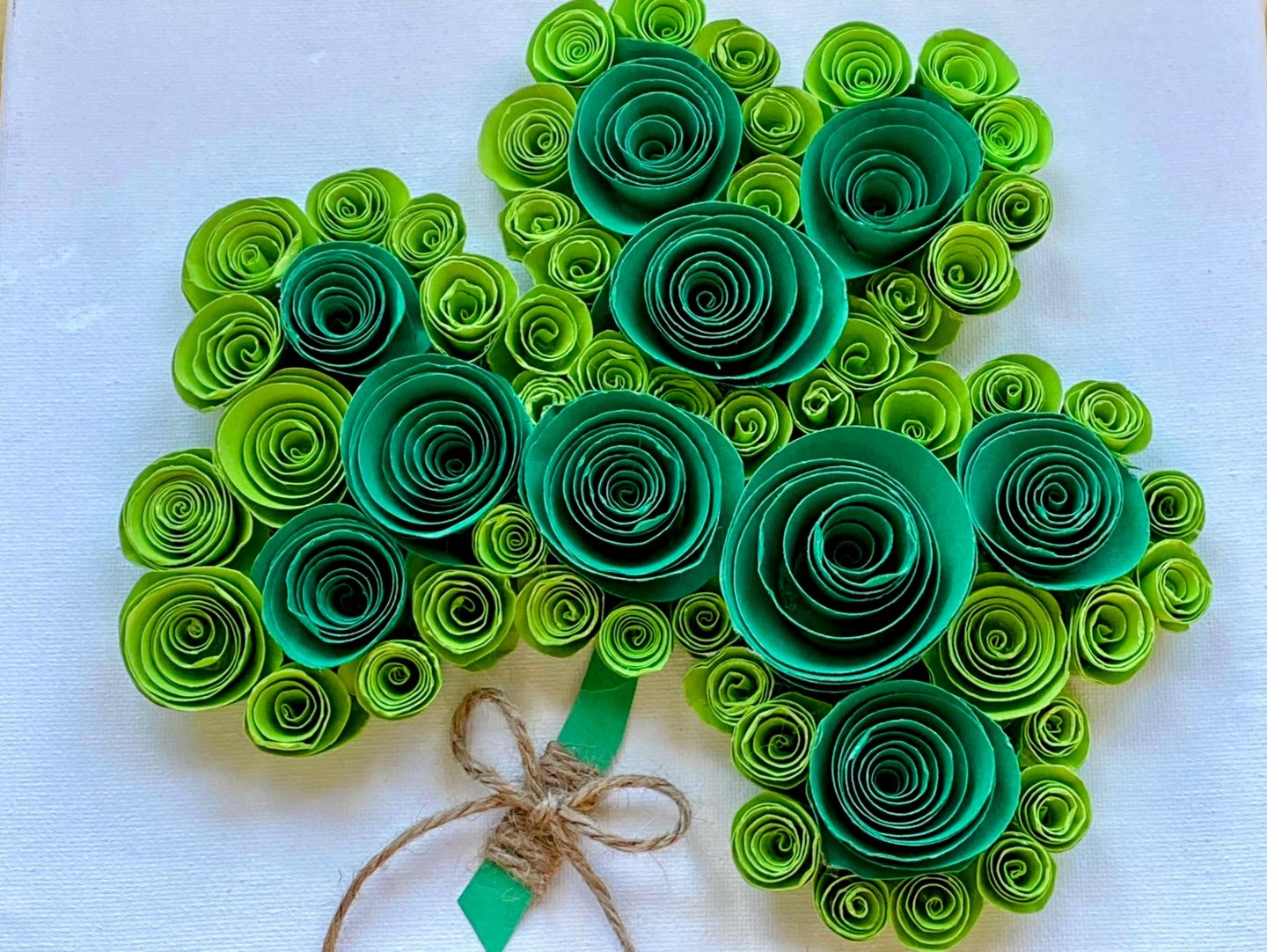 Learn how to cut, curl, and arrange rolled paper roses in a shamrock shape on an 8x10" canvas with twine detail.