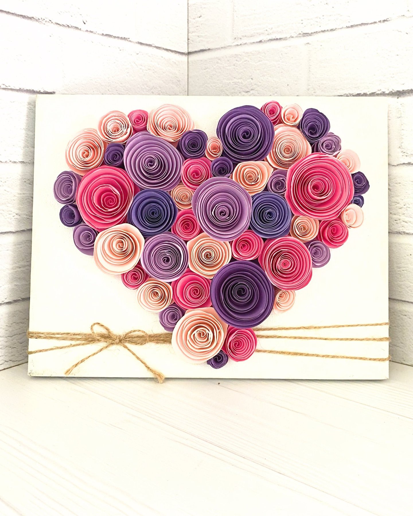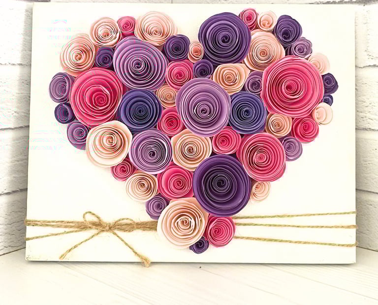 Learn how to cut, curl, and arrange rolled paper roses in a heart shape on an 8x10" canvas with twine detail.