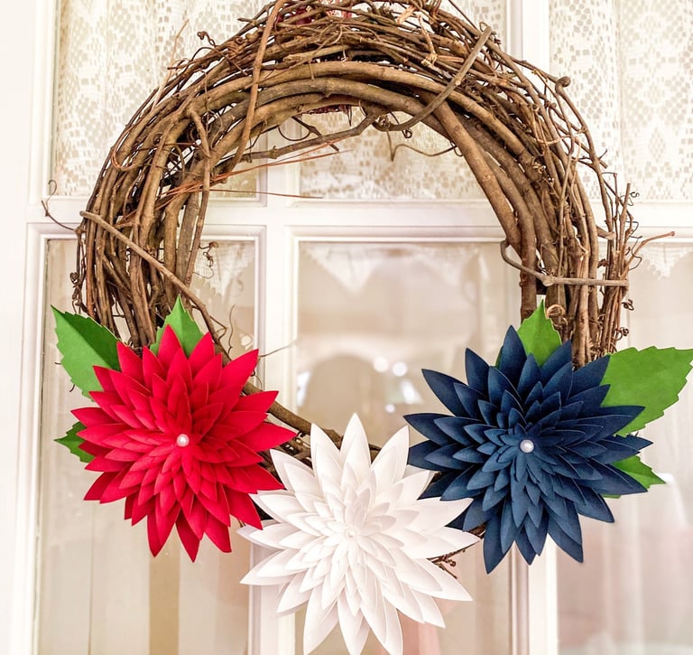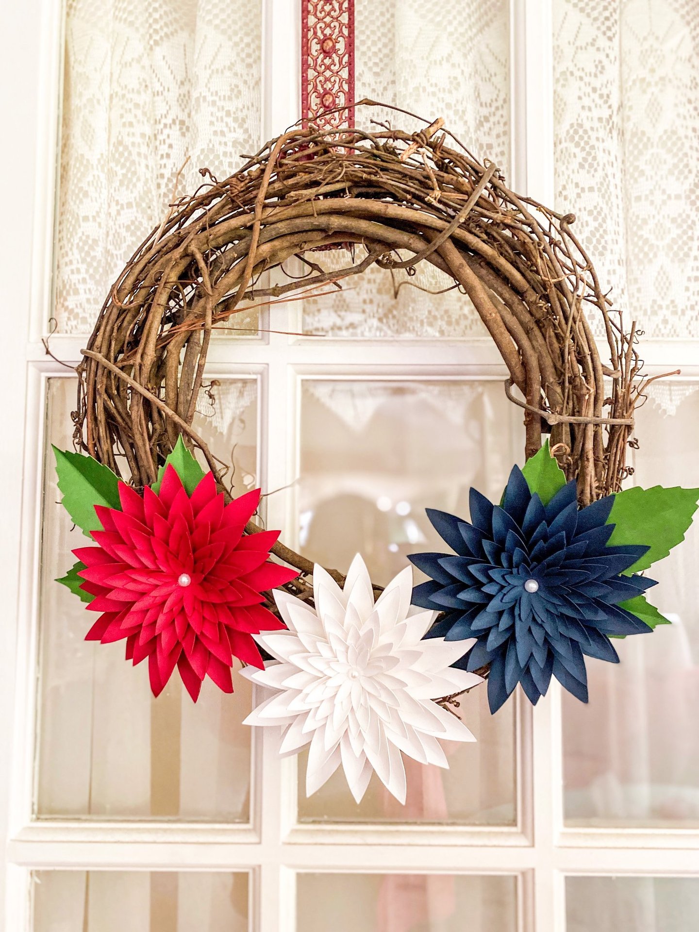 Learn how to make a beautiful paper dahlia 14" vine wreath using patriotic colors as a fun, hands-on craft perfect for your door, wall, or summer celebrations!