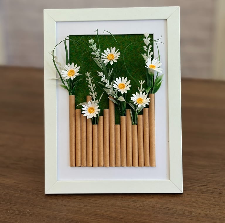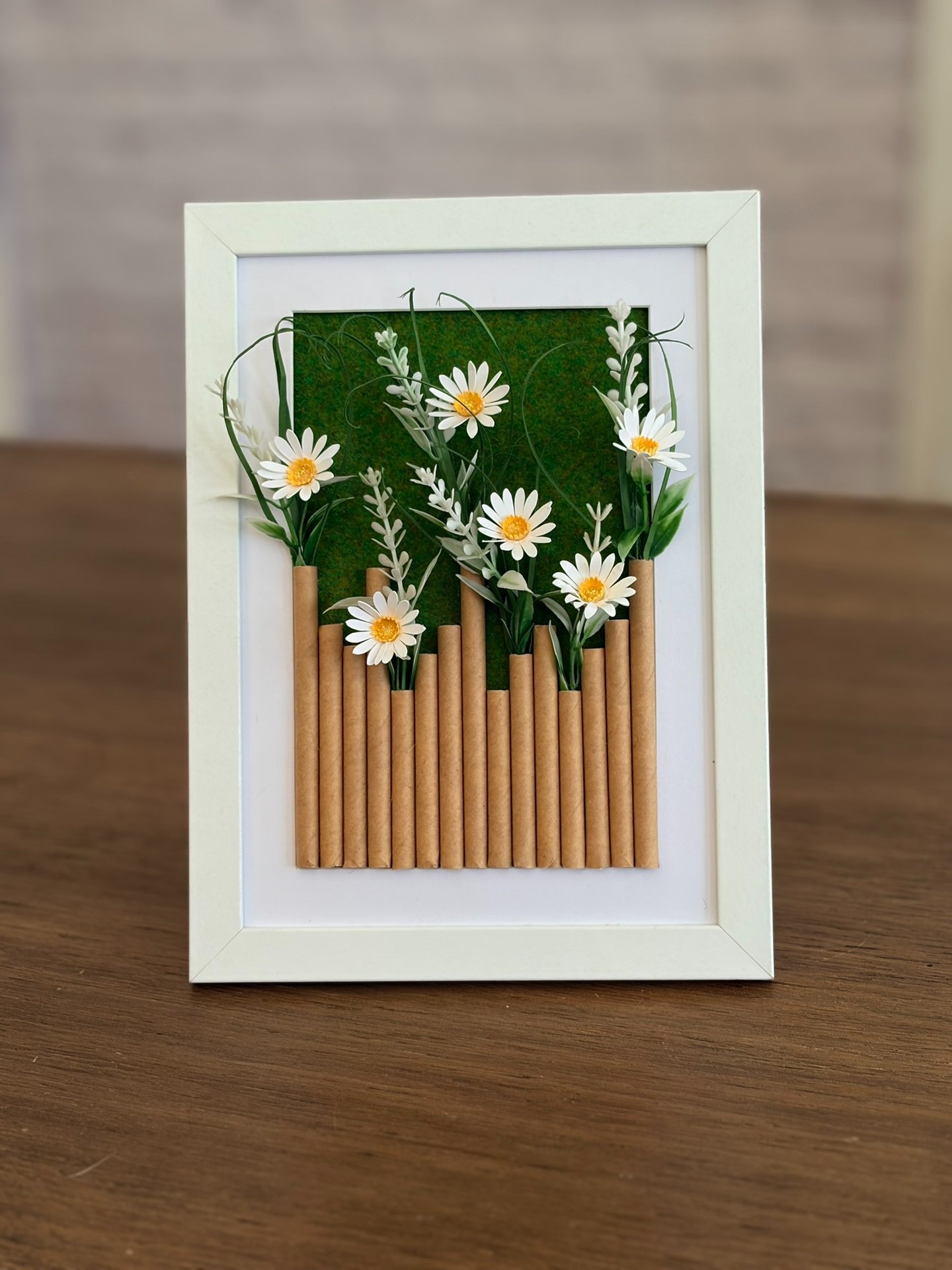 You’ll design a beautiful floral display using handcrafted paper daisies and cut straws, arranged inside a 5x7 white frame, adding depth, color, and playful detail behind your flowers.