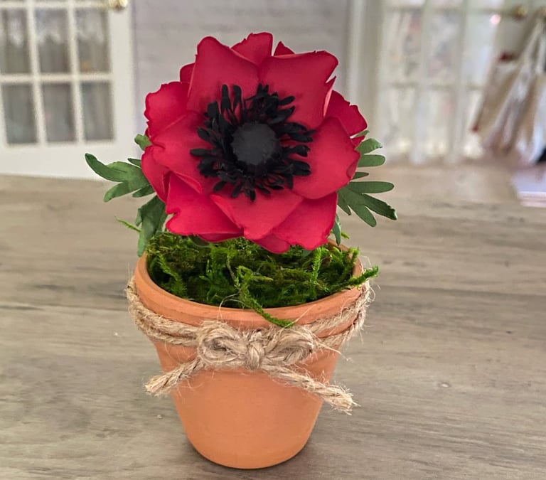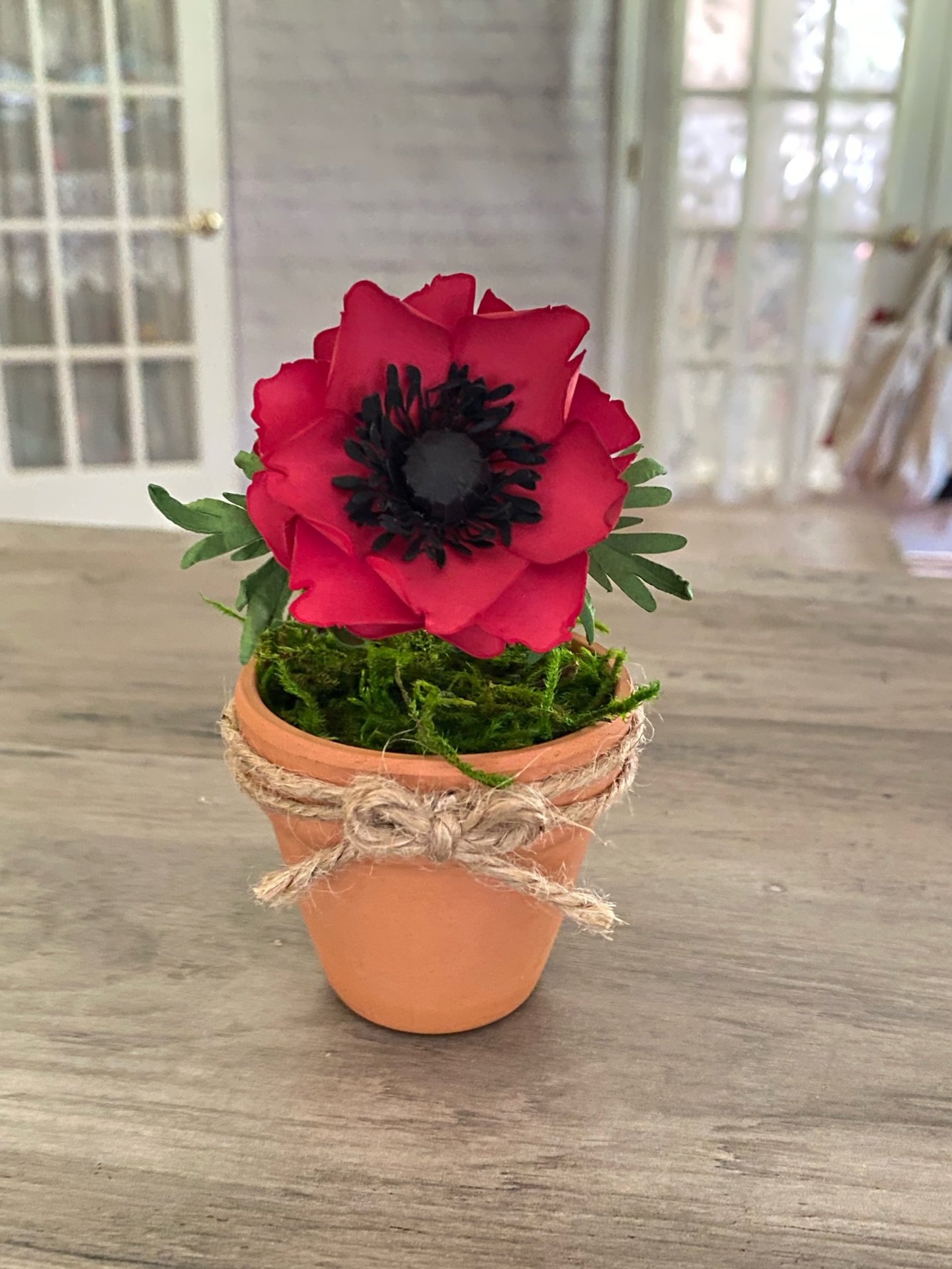 Learn how to create a beautiful, eco-friendly paper poppy in your choice of color, using special tools & techniques, arranged in a cute 2" terra-cotta pot with moss & twine detail that will last forever.
